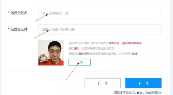 提交身份信息,手持的时候要注意地址,身份证号码一定要清晰看得清 ,注意,一定要右手单手持,很多朋友用双手持的导致审核被驳回。看图中手持照片的正确姿势~