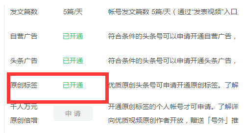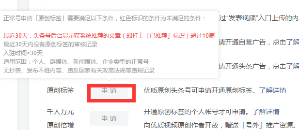 上面说的是用文章开原创的办法,用文章开的话,相对比较辛苦一点。关于开原创,头条号体系后台的要求是账号注册时刻大于30天,30天内已引荐的文量要大于十篇,为了稳妥起见,尽量多写一些,这样审阅经过原创的概率会大一些。