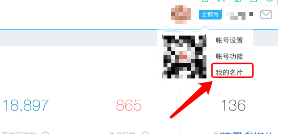 进入企鹅号后台(网址:om.qq.com)以后,鼠标放在后台右上角的企鹅号图标上,会显示上图。点击我的名片,打开,即可看到自己的企鹅号领域的。