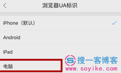 点击 浏览器UA标识,选择最下方的电脑模式。