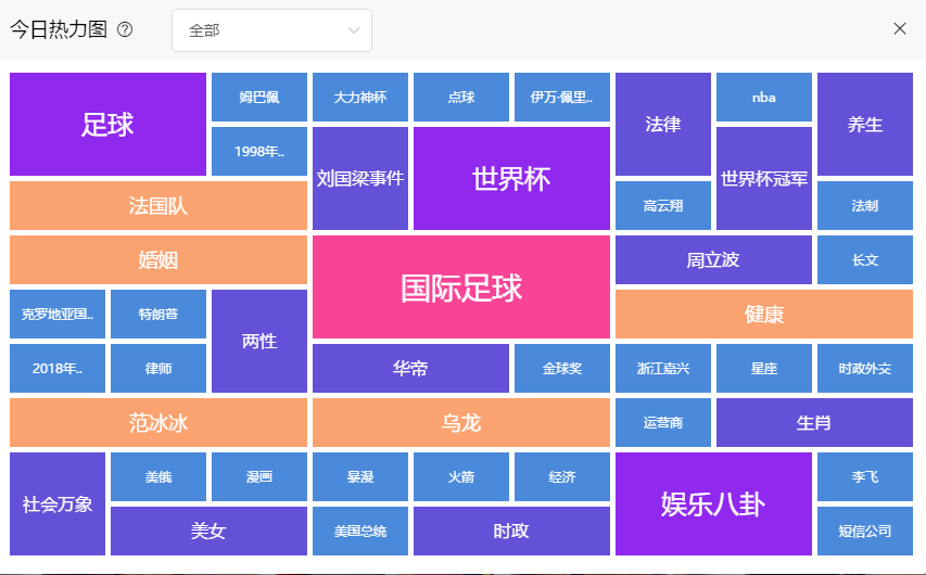 选取个平台热门文章,将热点关键词按照热度进行区域划分,区域越大,热度越高,让你更直接的把握今日热点趋势。